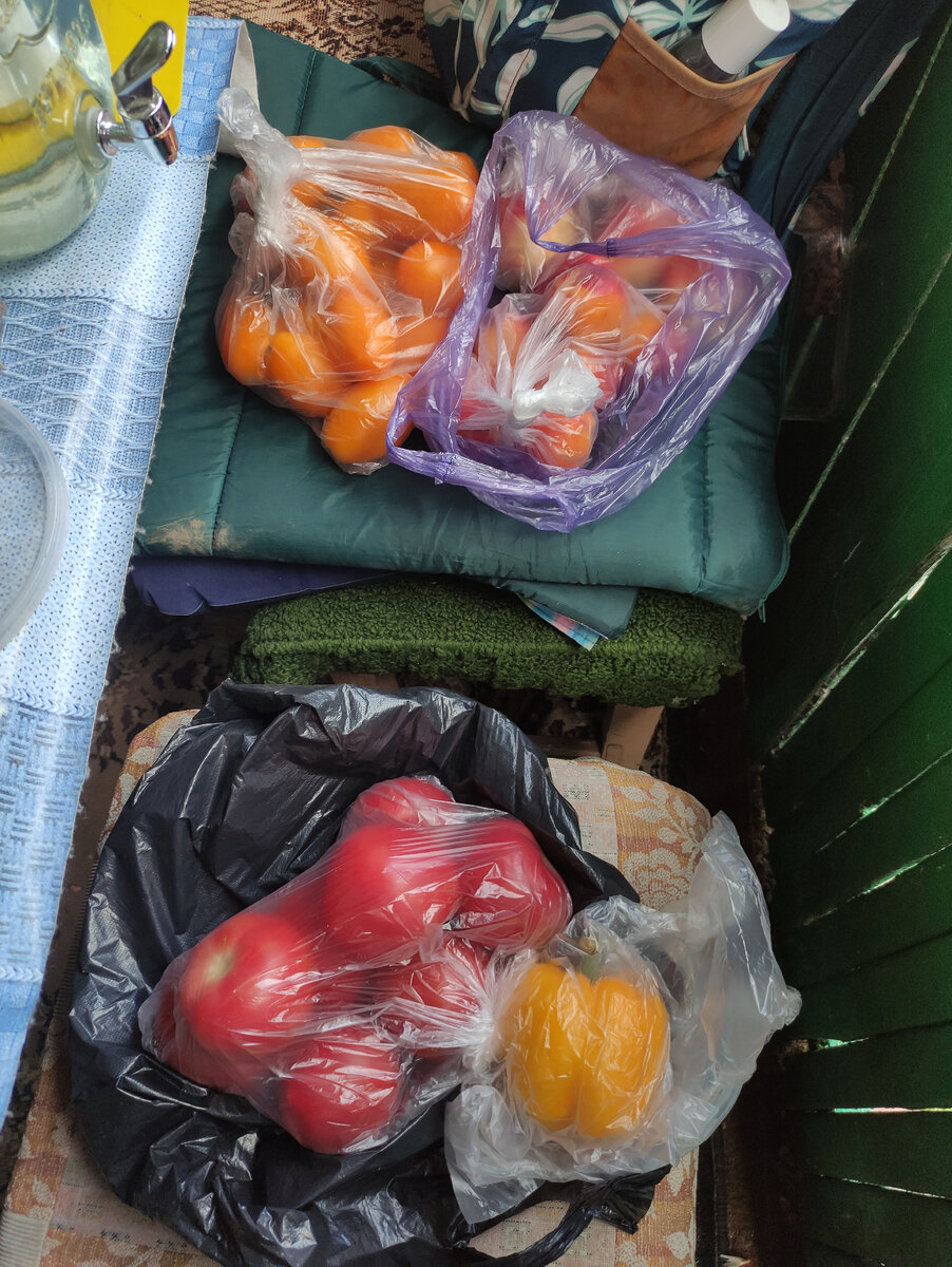 После заехала домой, взяла кроссовки и кое-какие шнуры (о них я вообще забыла), а затем заскочила на рынок. Вот мои покупки: огурцы, салат, зелень, чеснок — всё это уже выросло на даче, а помидоры пока ещё зелёные.